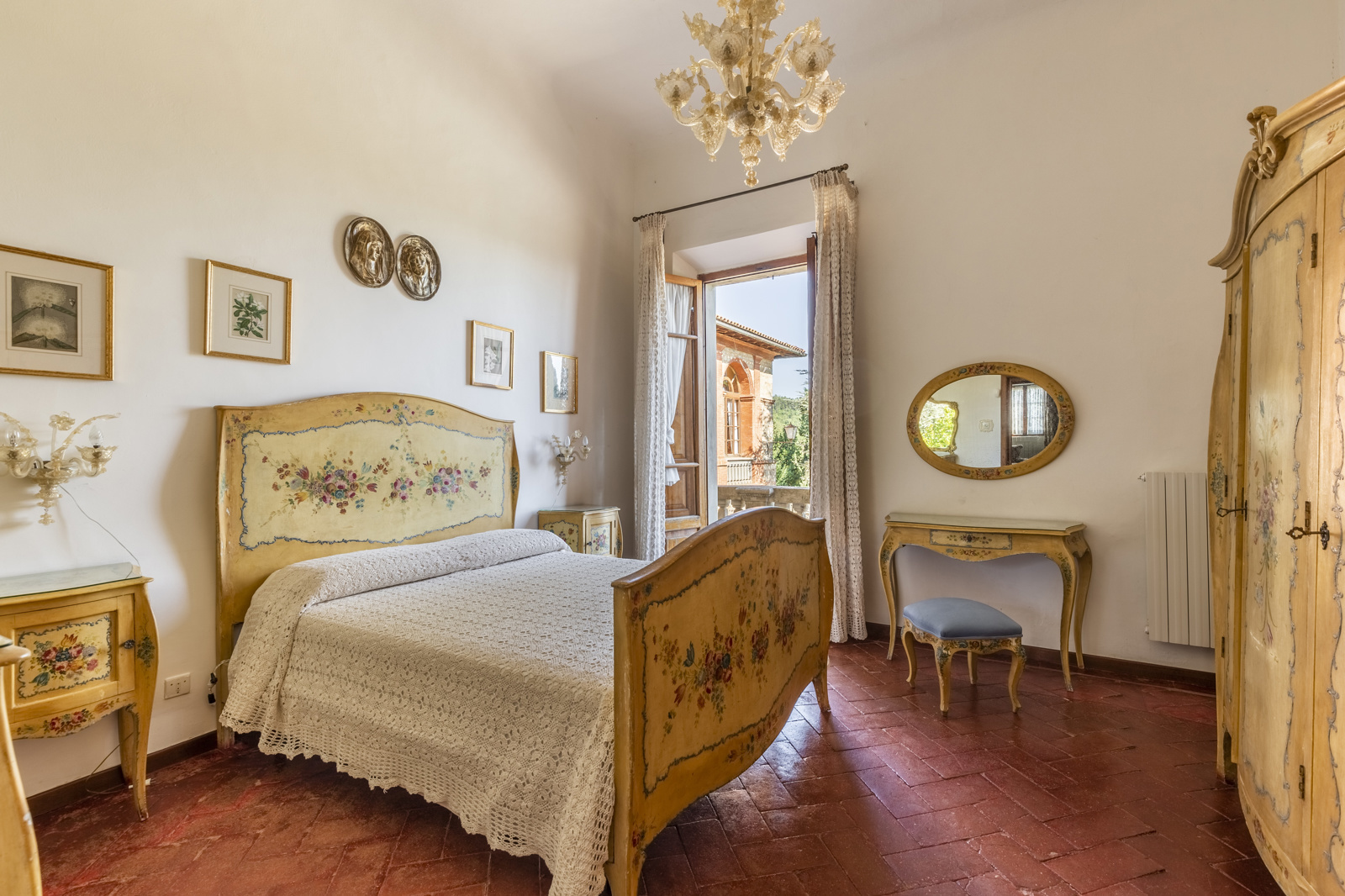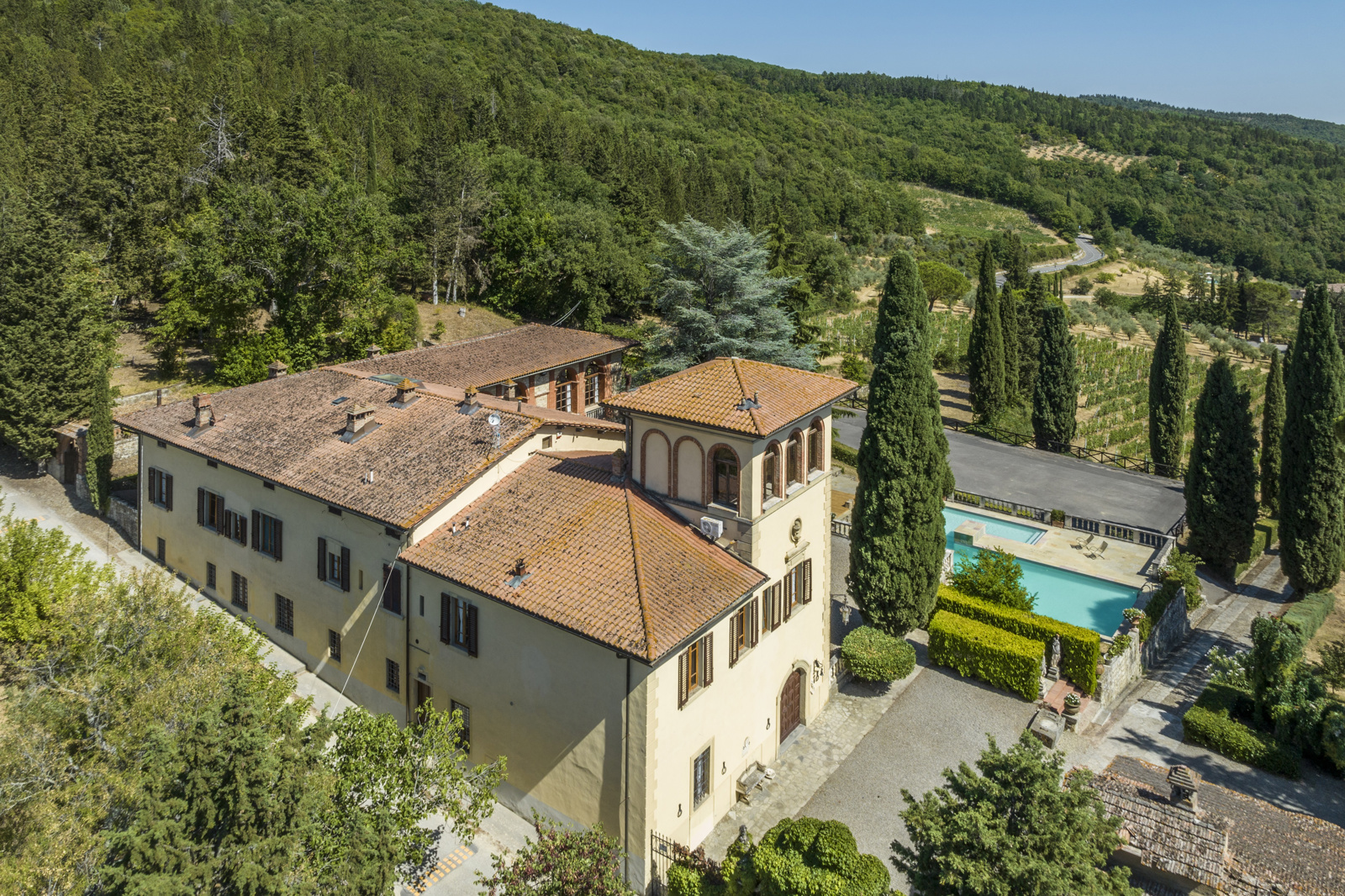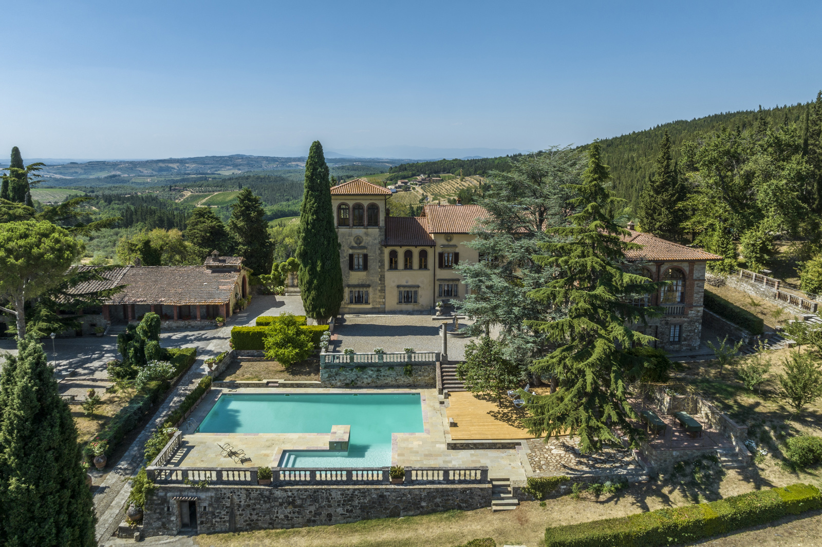 Driving along the Val D’Elsa regional road you reach the estate and the farm created in 1961. It is a medieval village dating back to the year 1000 AD. The historic manor house is admired in all its architectural beauty as soon as you come down the private driveway surrounded by ancient olive trees. We are greeted by a succession of very bright living rooms and intended for reception and the large kitchen, upstairs is the sleeping area with 5 large double bedrooms and three bathrooms for a total of 100 square meters. Wonderful terraces, loggias and belvedere for about 2600 sqm. A short distance away is the majestic lemon house and the family chapel. A large farmhouse building recently restored has been didided into four lovely agritourism apartments (in addition to the one of the caretaker) and a small independent farmhouse a few steps from the main borgo, as well as a beautiful swimming pool, with romantic views over Chianti.
