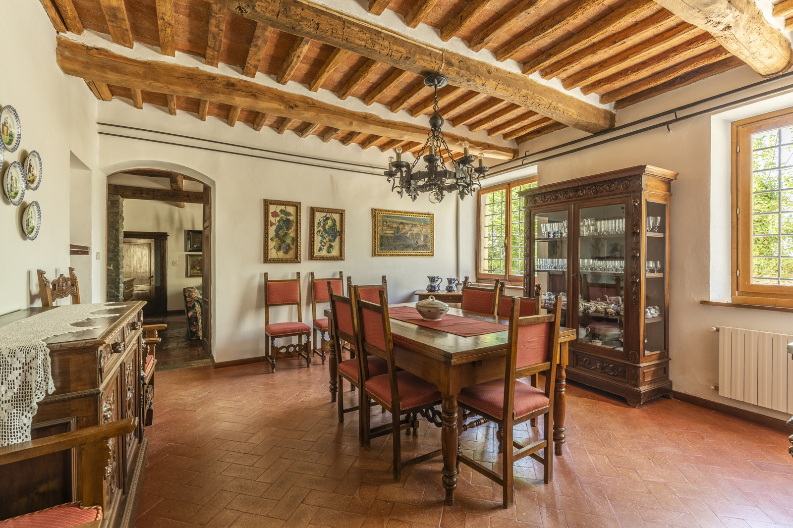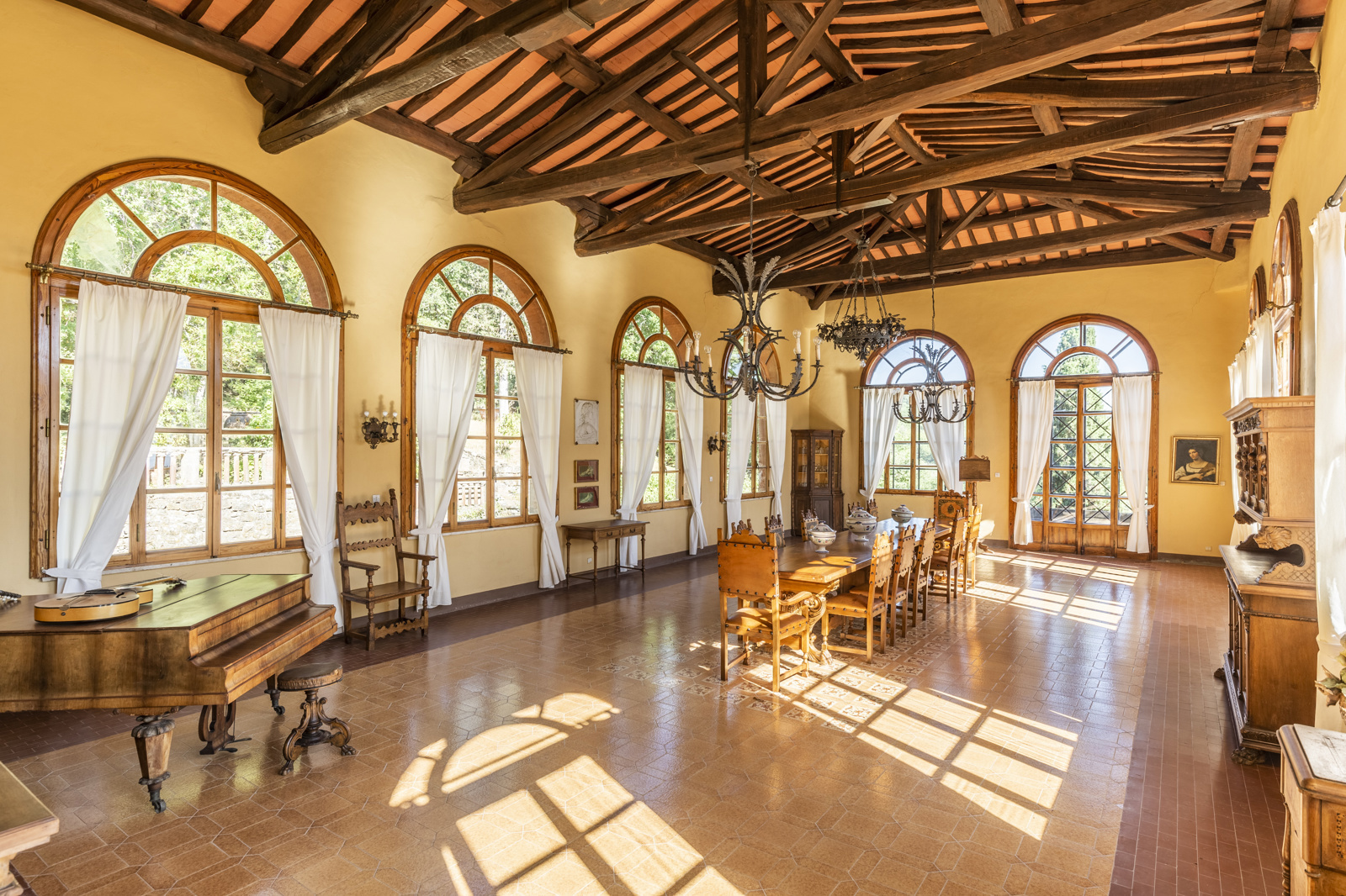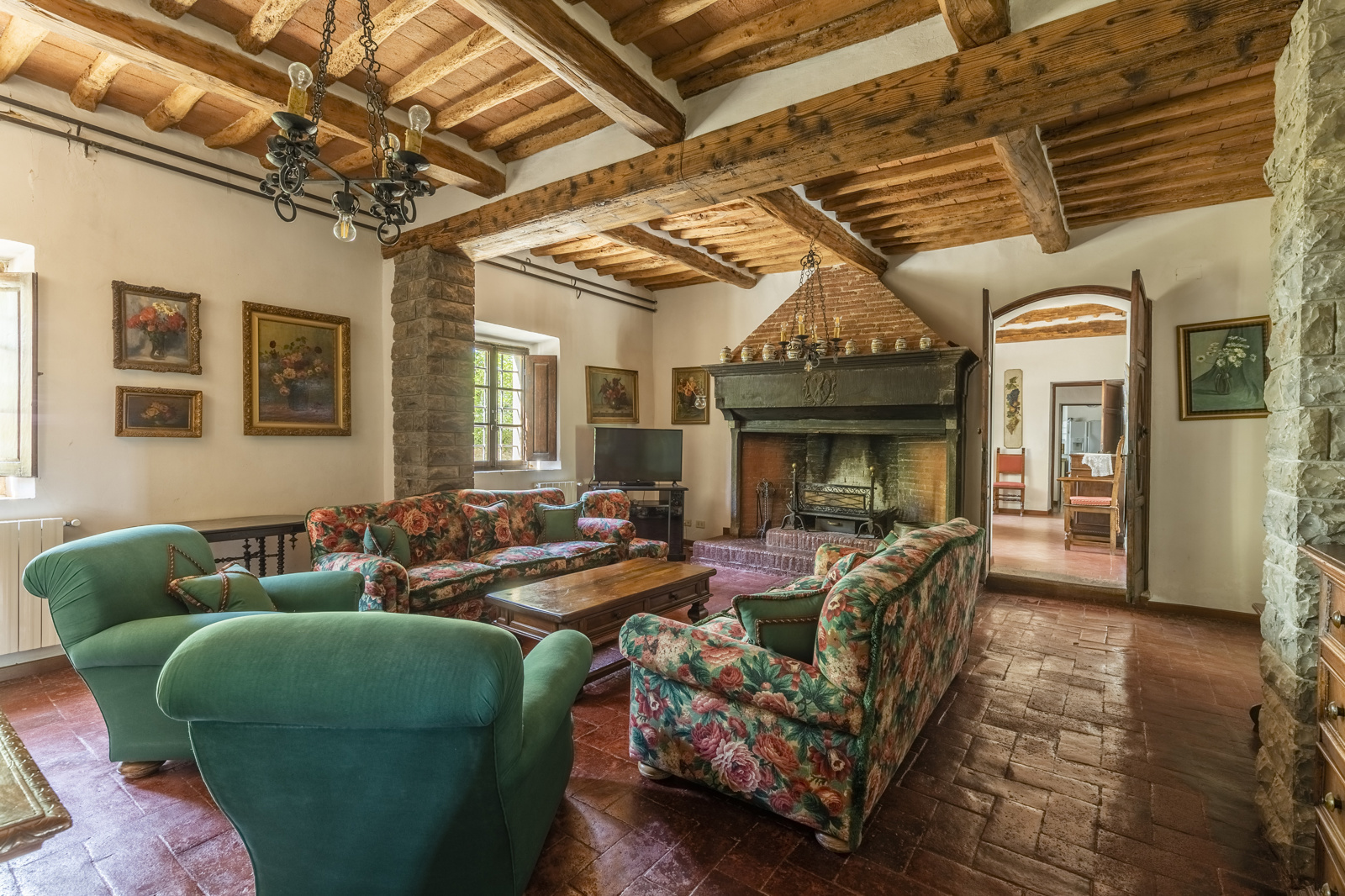 The large estate complex is excellently maintained. The renovation has been conservative and typical Tuscan with terracotta floors and chestnut wood beams. The high ceilings of the villa and the large windows give natural light to the living area, the bathrooms are in precious ceramics and the ancient stone fireplaces very scenic. The part intended for the farmhouse is in stone, the rooms are tastefully furnished in rustic style and very welcoming. The facilities are up to standard, the various structures does not require extraordinary maintenance work.