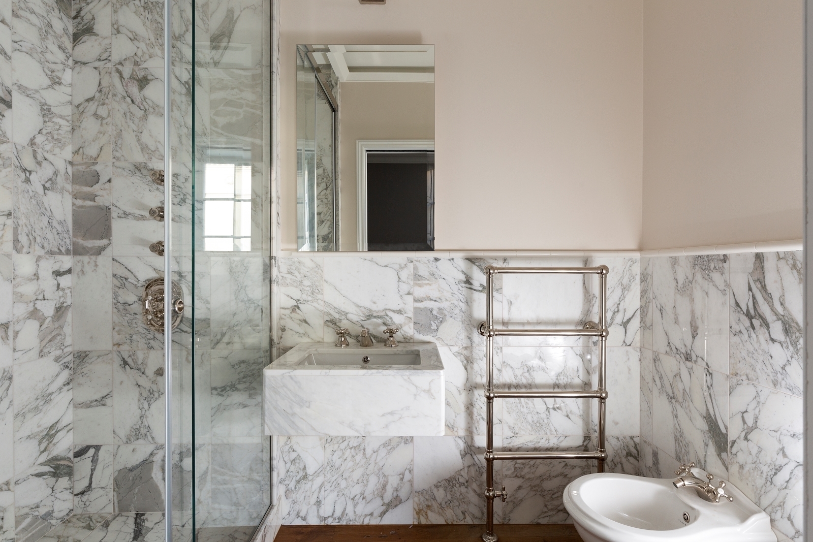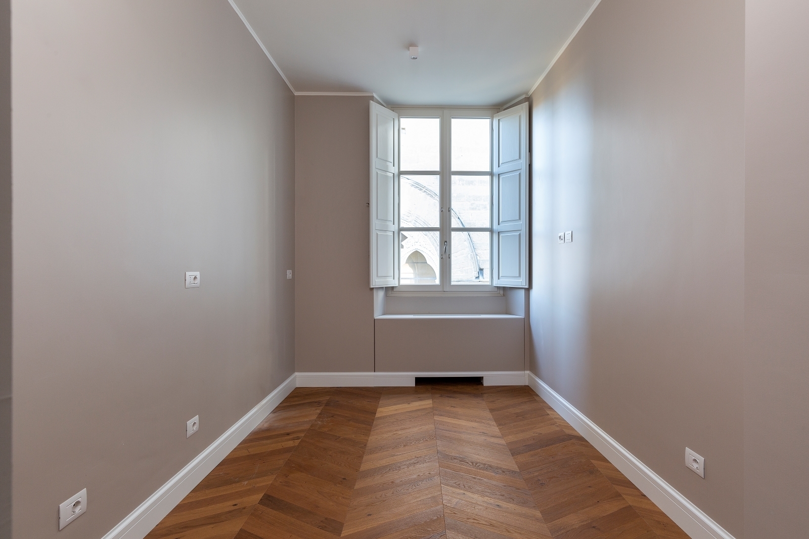 Large living area with numerous windows that make it very bright, completely separate kitchen that could if wished be converted into a single bedroom, as well as two large bedrooms with en-suite bathrooms, finely restored with quality materials such as marble and paper wallpaper.