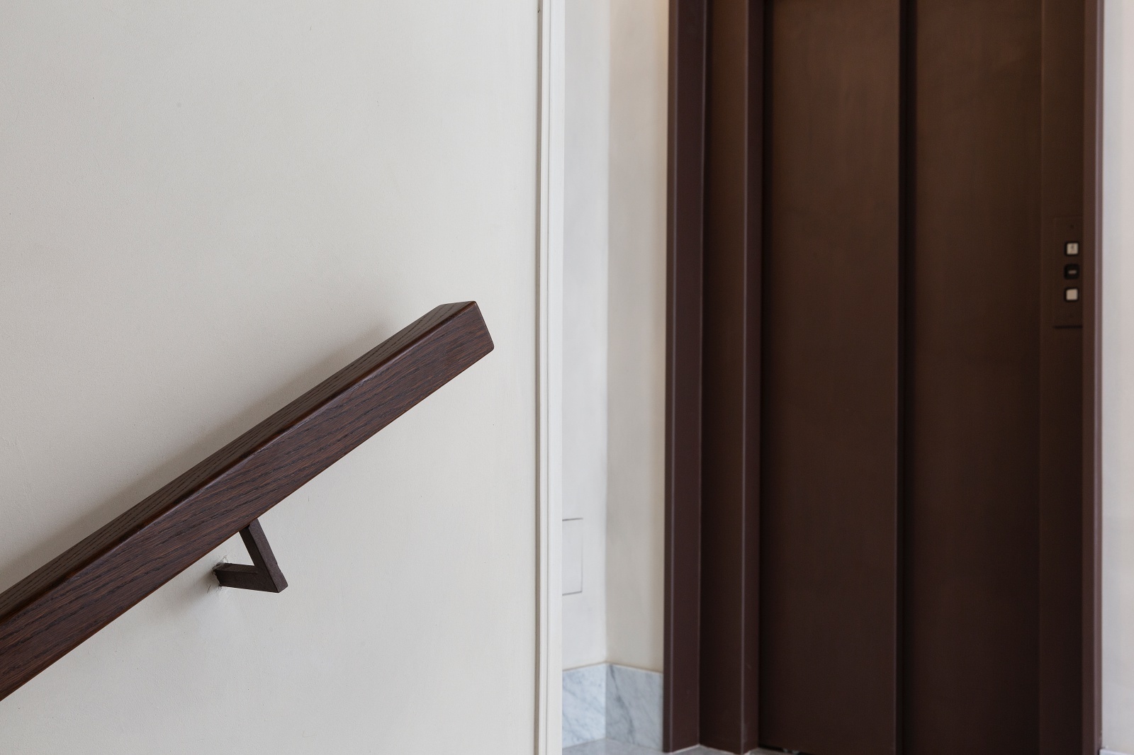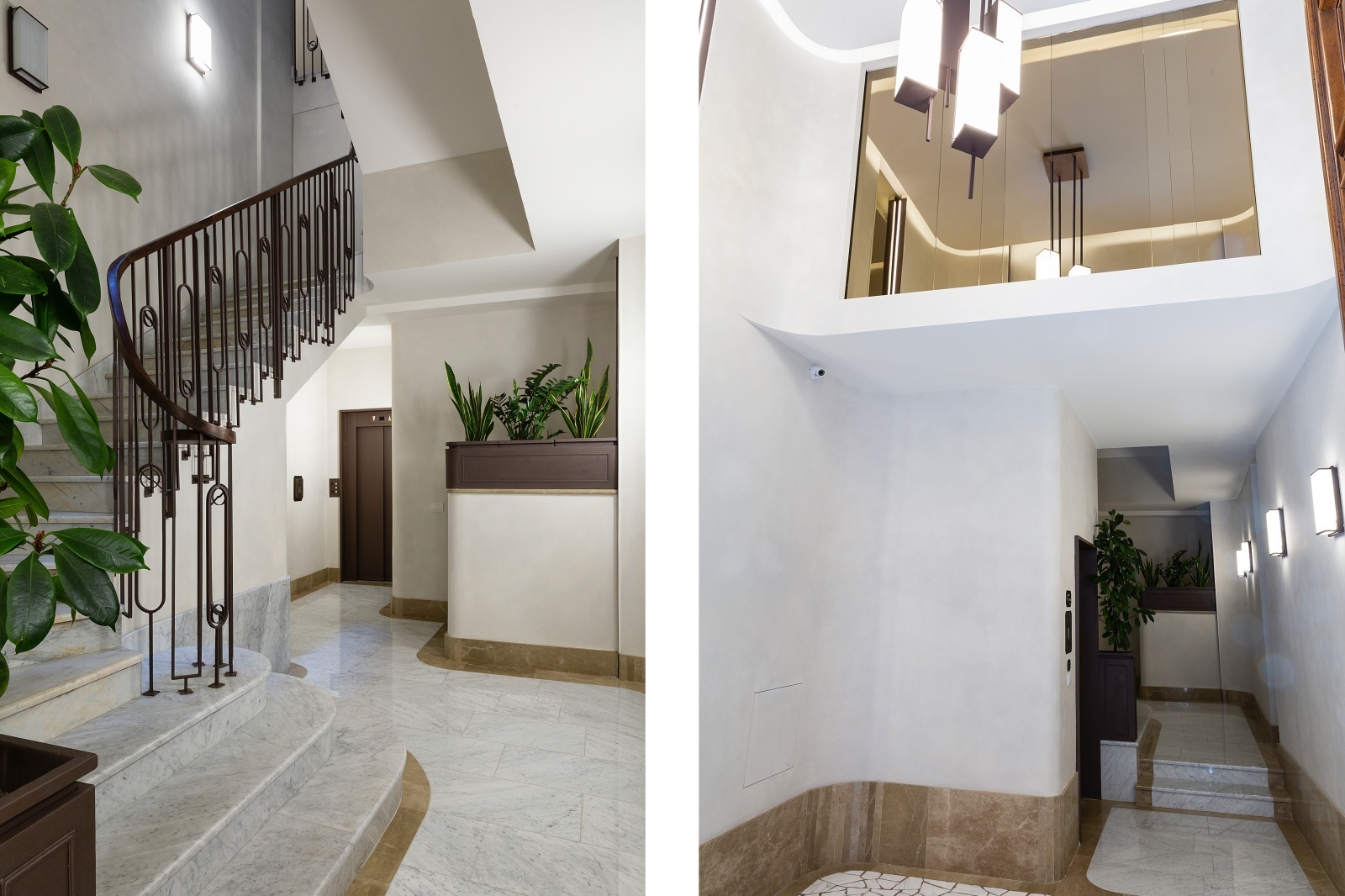 The entrances of the eleven residences overlook a bright staircase. Floors in light emperador marble and an imposing staircase in white Carrara marble: the choice of materials for these rooms is inspired by the Church of Orsanmichele, with typical details of Florentine palaces such as the dark metal balustrade, the light frames and the ivory patina.