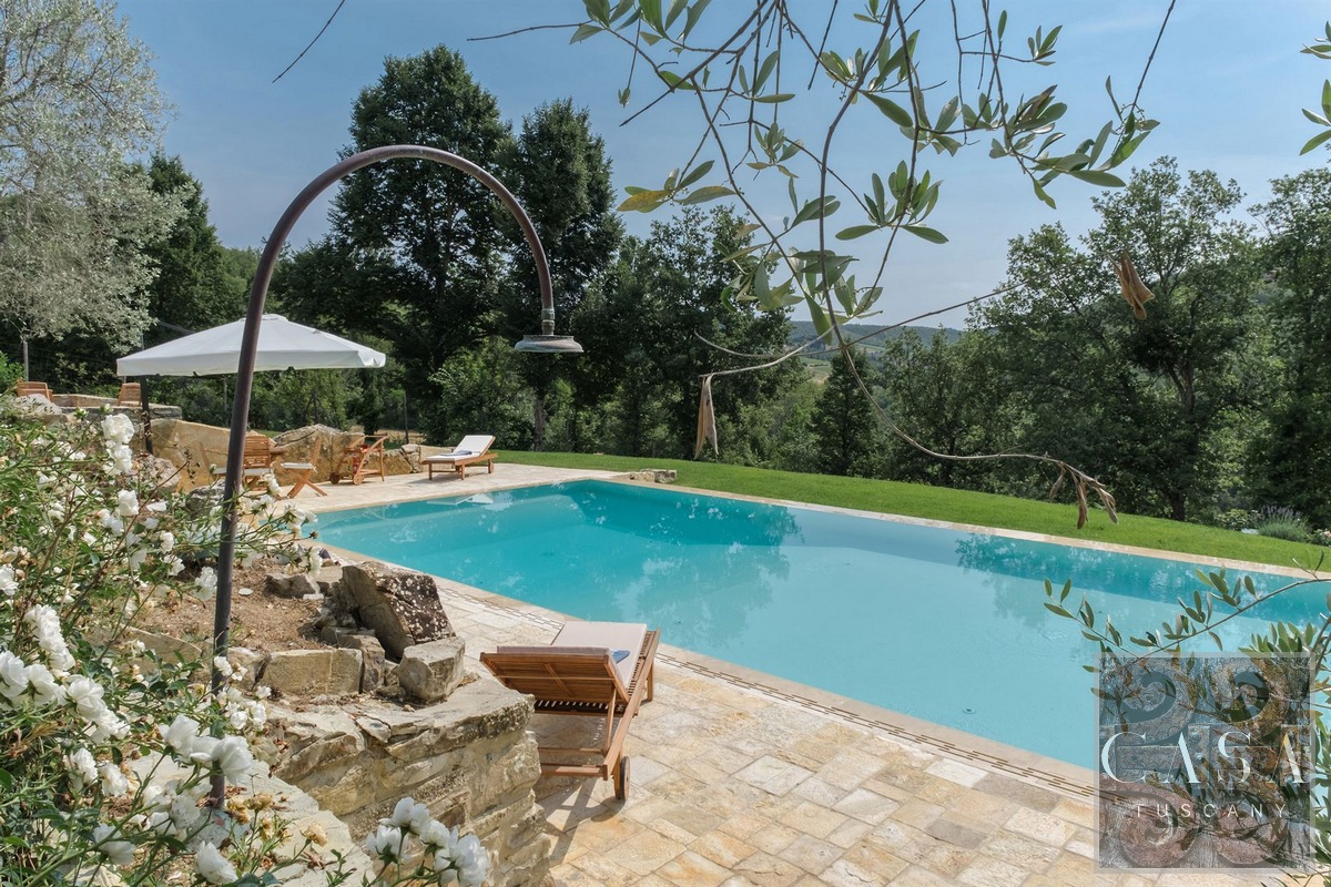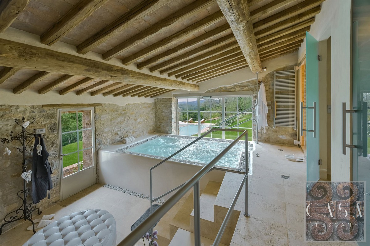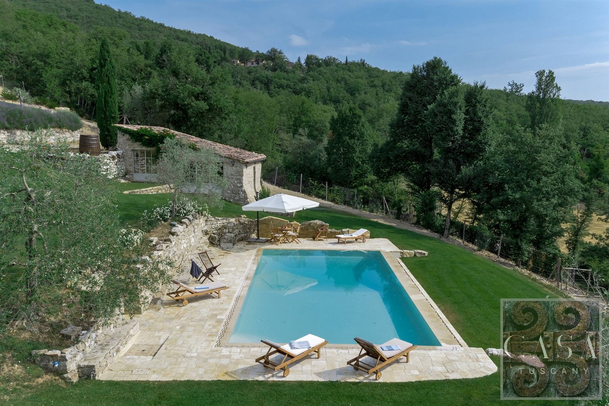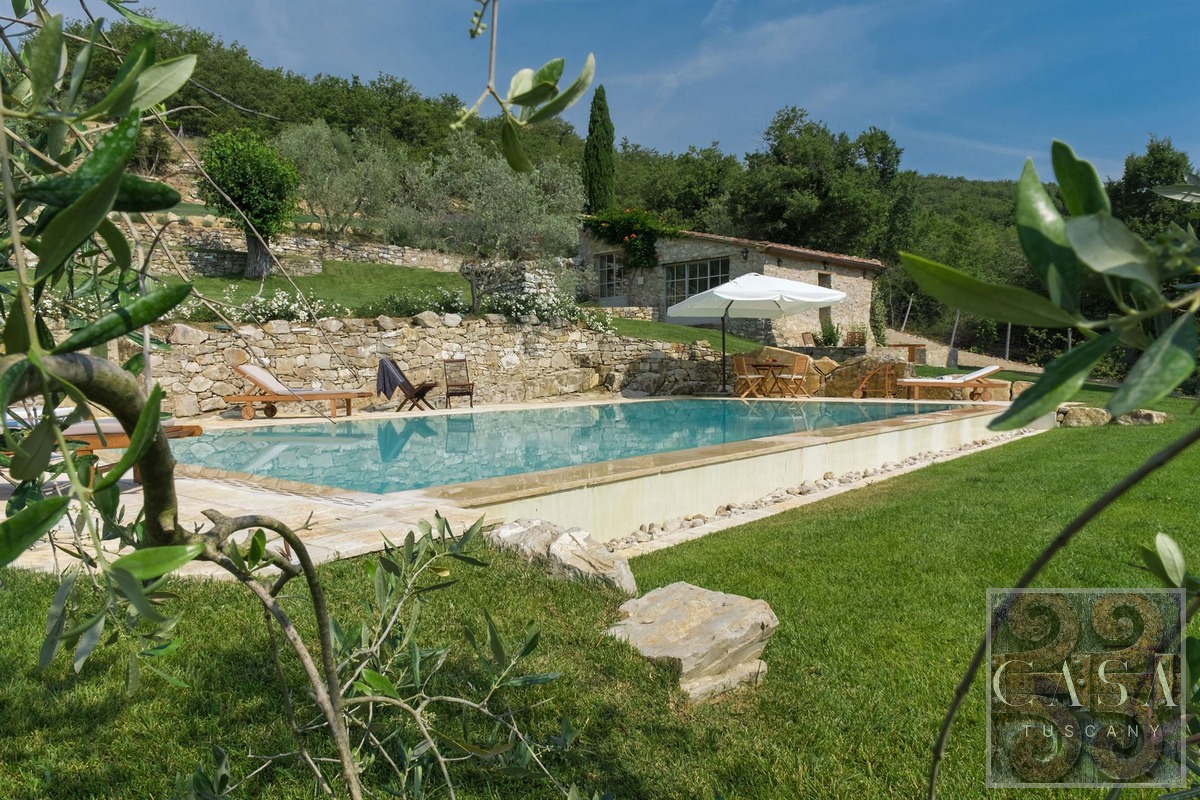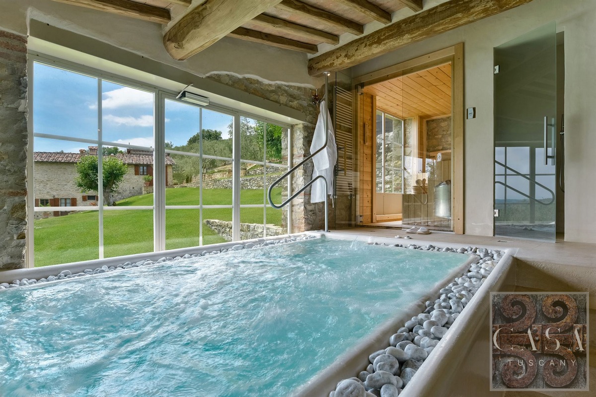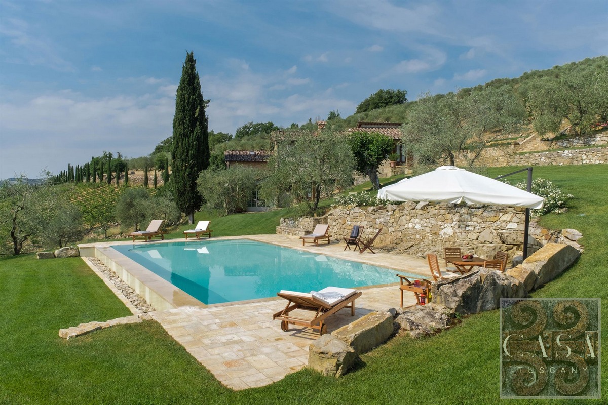 Restored stone country villa with panoramic views, outdoor pool, spa with heated pool, in the Chianti Classico region close to Radda in Chianti.