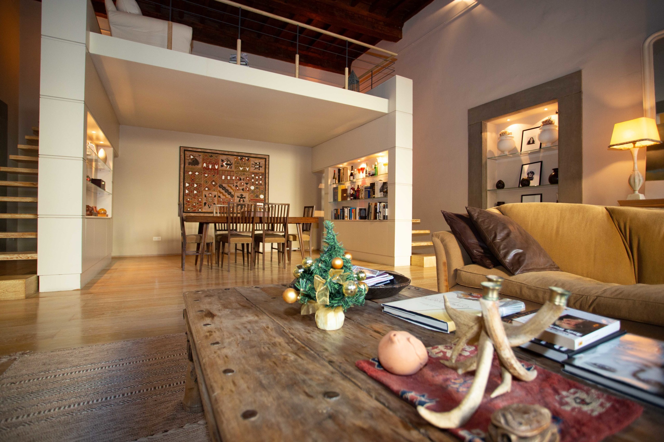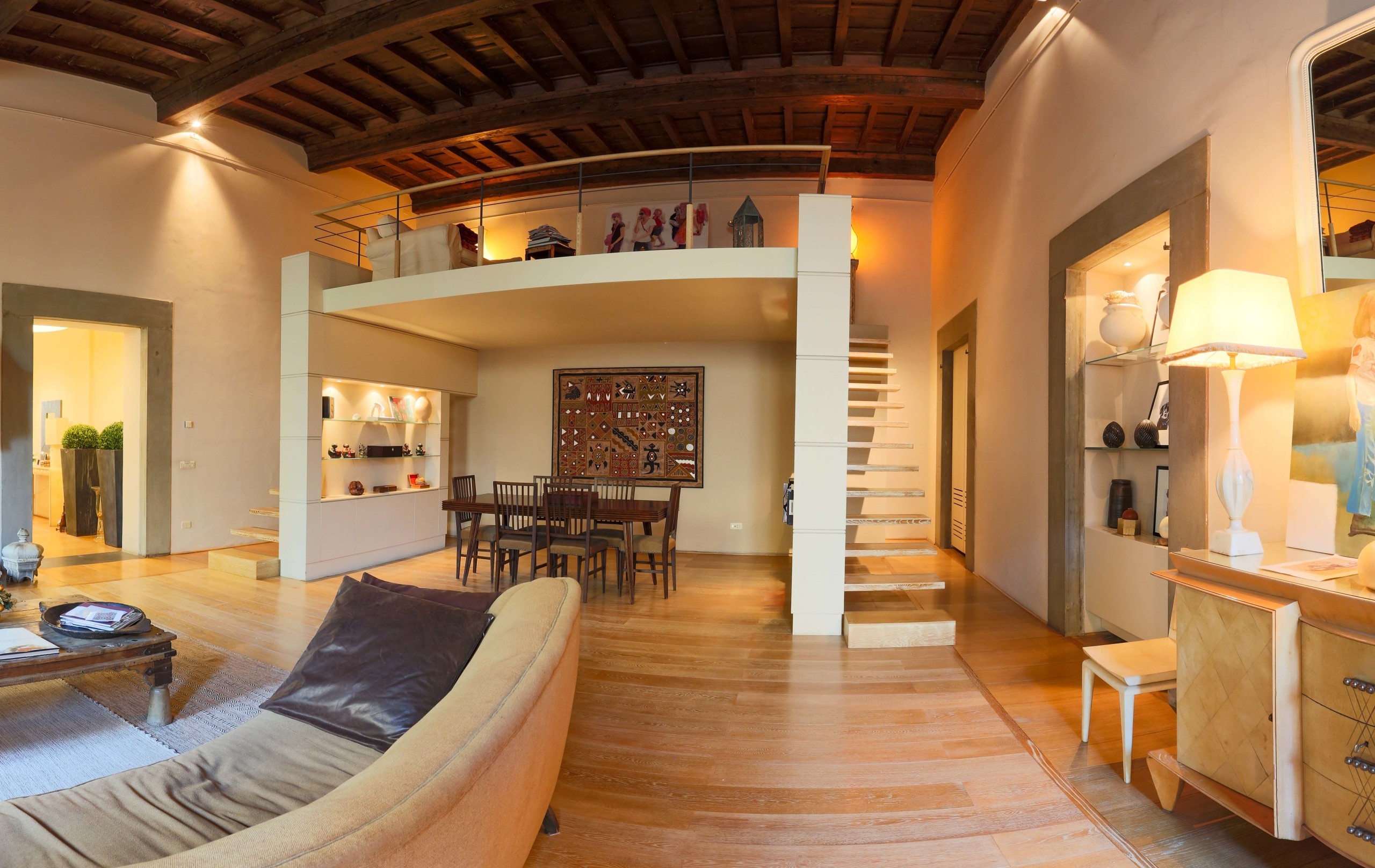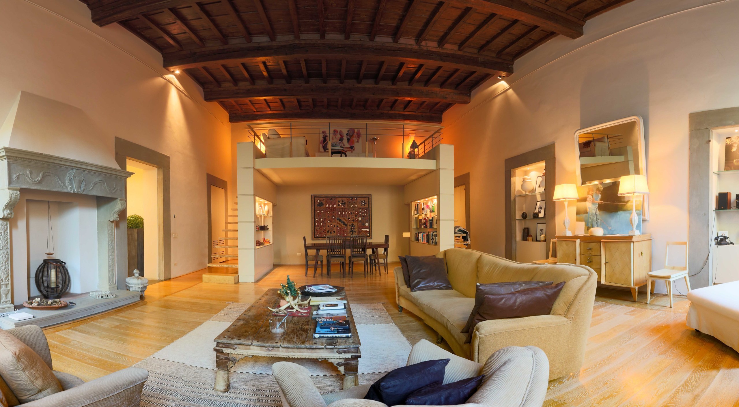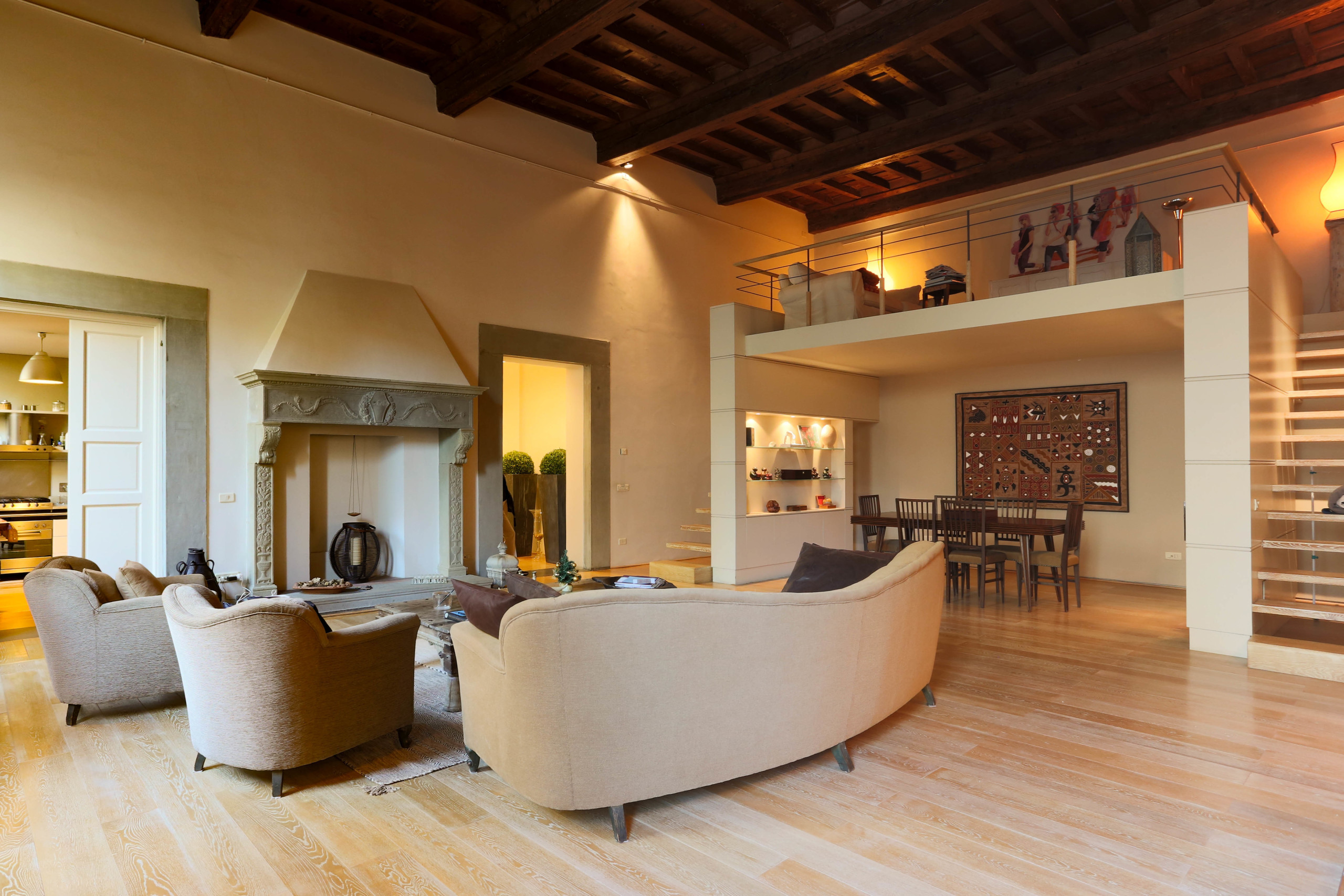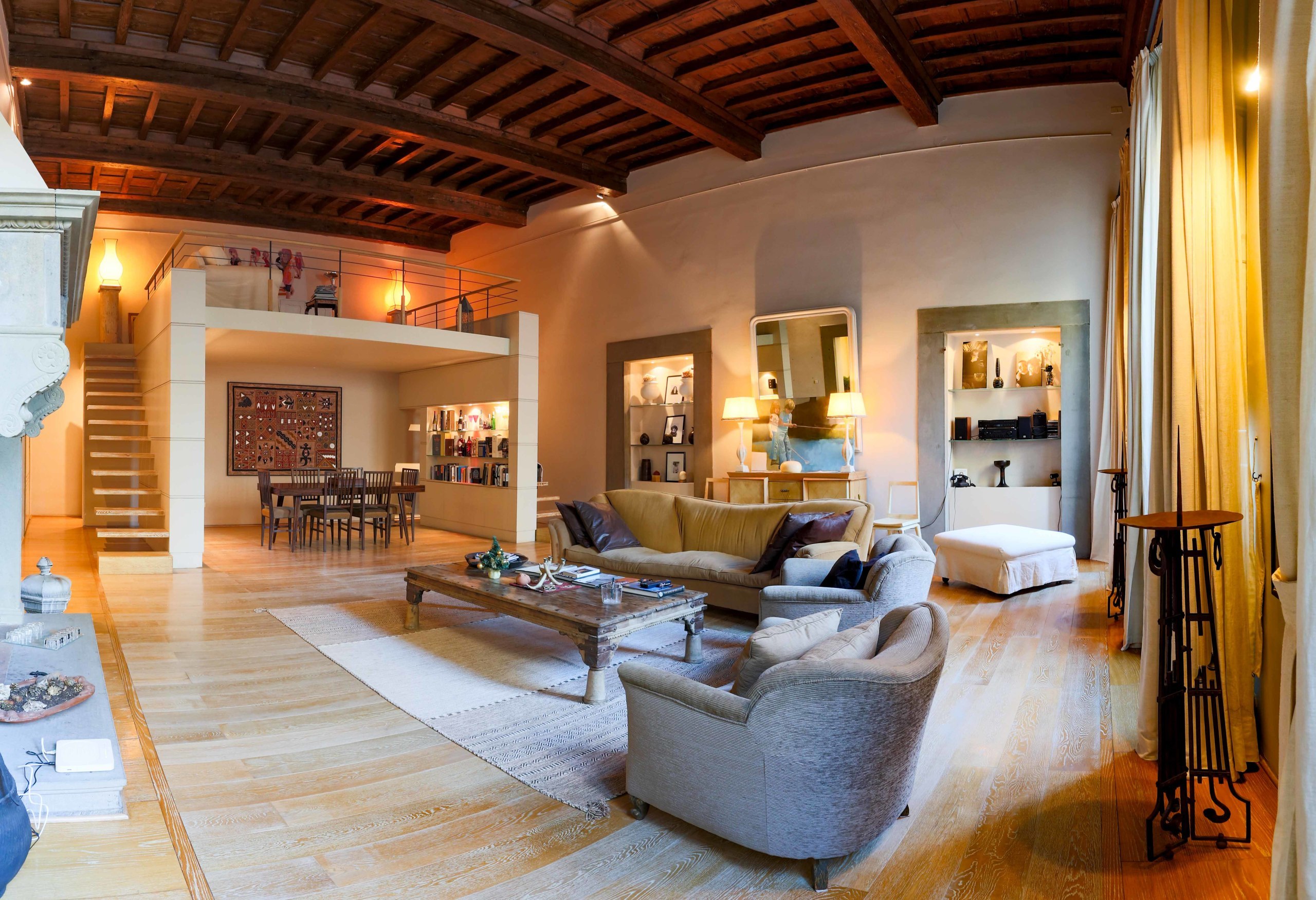 The renovation took into account the context in which the apartment is located, combining ancient and modern. The coffered ceilings in solid wood, the imposing fireplace with a porphyry frame, the wooden window frames marry beautifully with the parquet in precious wood, the wooden and glass staircases.