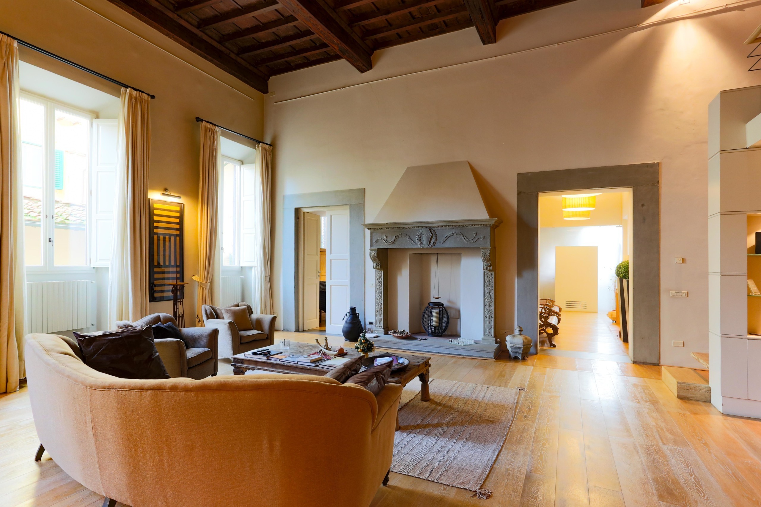 The historic building is located a few steps from Piazza del Duomo, on the first floor, a corner apartment with an important size. The entrance door opens onto a corridor at the end of which the large hall with important heights, where a versatile space has been created with a loft furniture, guest room, study, relaxation room, the space below is used as a dining room with important furniture with a unique and refined design, on the sides a guest bathroom and several rooms that can be used as closets, in front of this space just described, there is the living room, a space characterized by high coffered ceilings, ancient fireplace in stone and with three windows that make it a very bright environment. The separate kitchen makes the living area more liveable. The bedroom is always a large and important space, consisting of an environment in which the sleeping area is situated on mezzanine level, with the study on the lower level and a large bathroom.