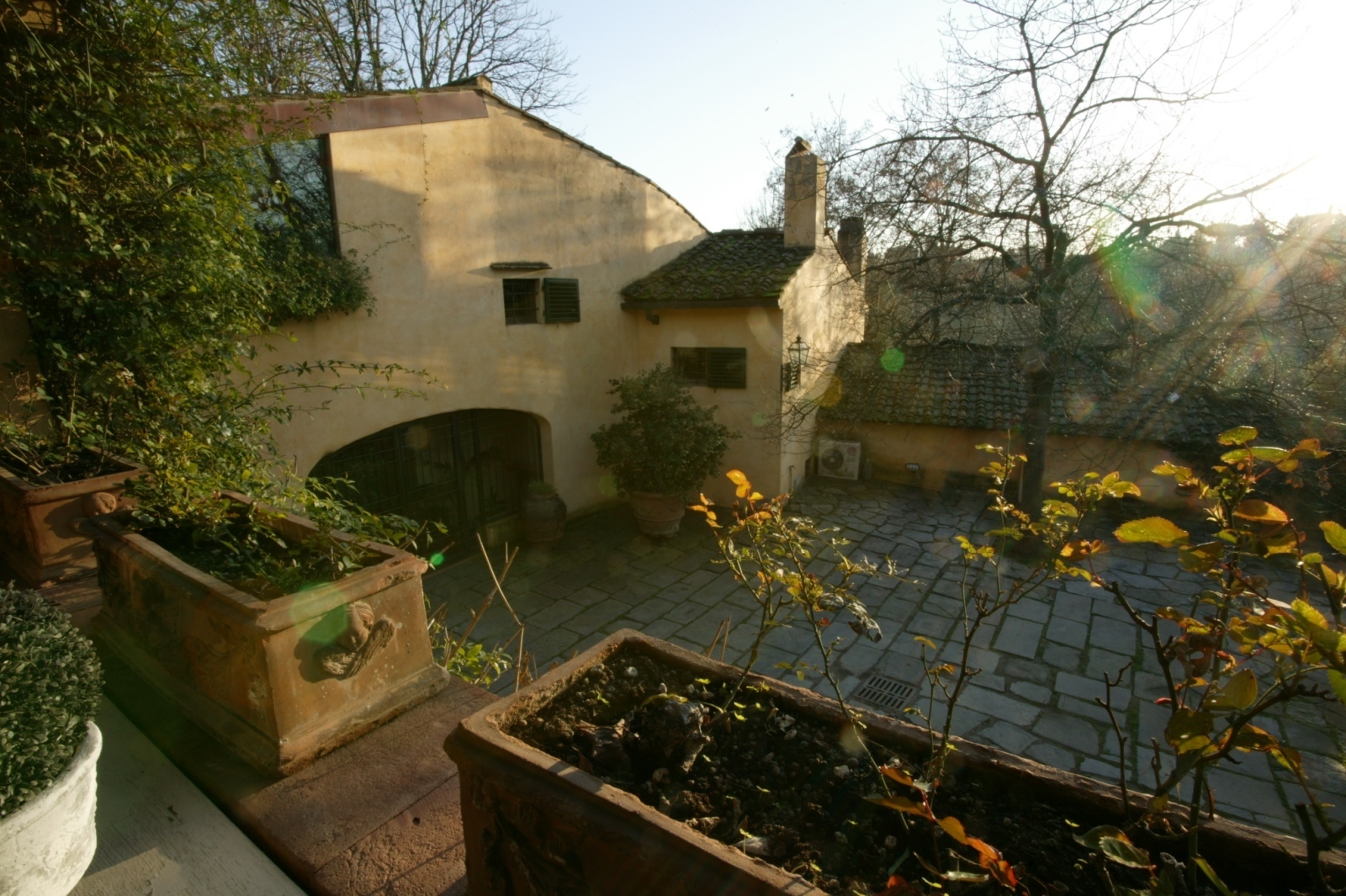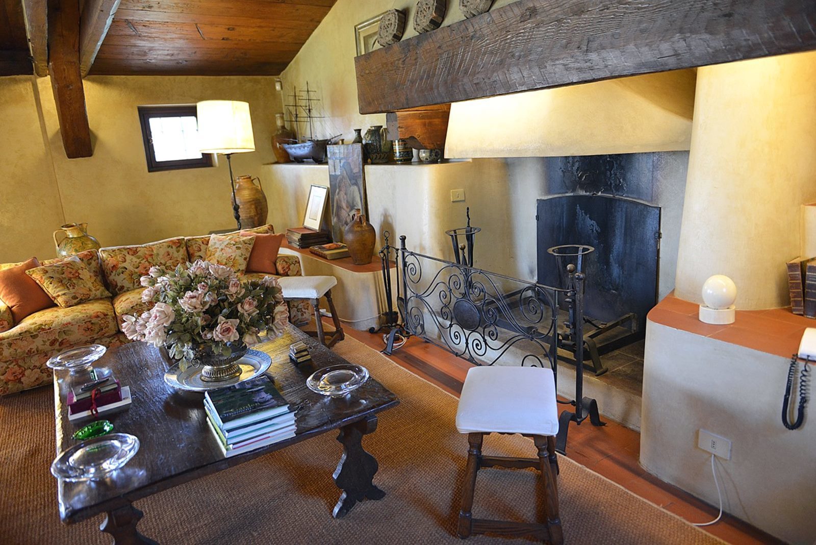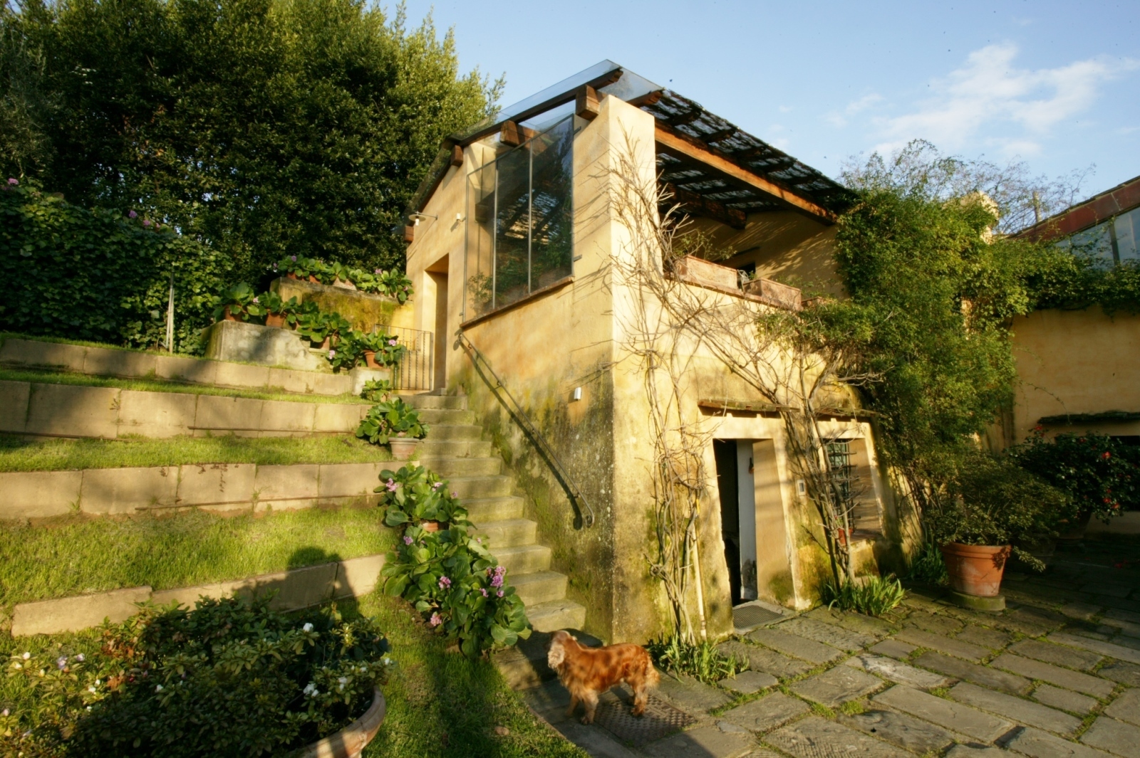 The style of the villa recalls very much in the use of materials and forms the traditional architecture typical of the landscape. The materials used are locally sourced: pietra serena for the steps, terracotta floors, chimney pots, roofs and window sills; chestnut wood for the structural floors, roofs and for the construction of internal doors. Wrought iron for furnishing elements and window grilles.