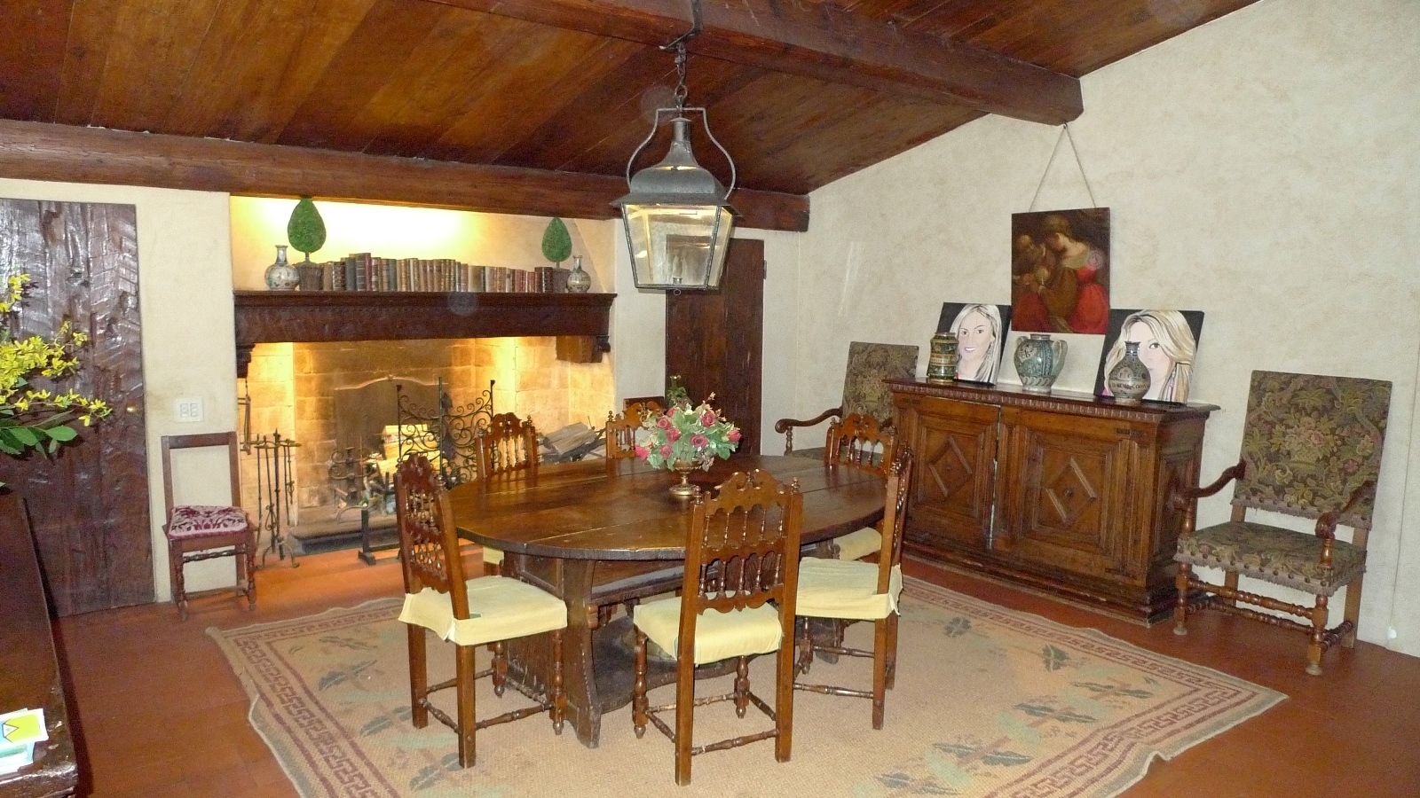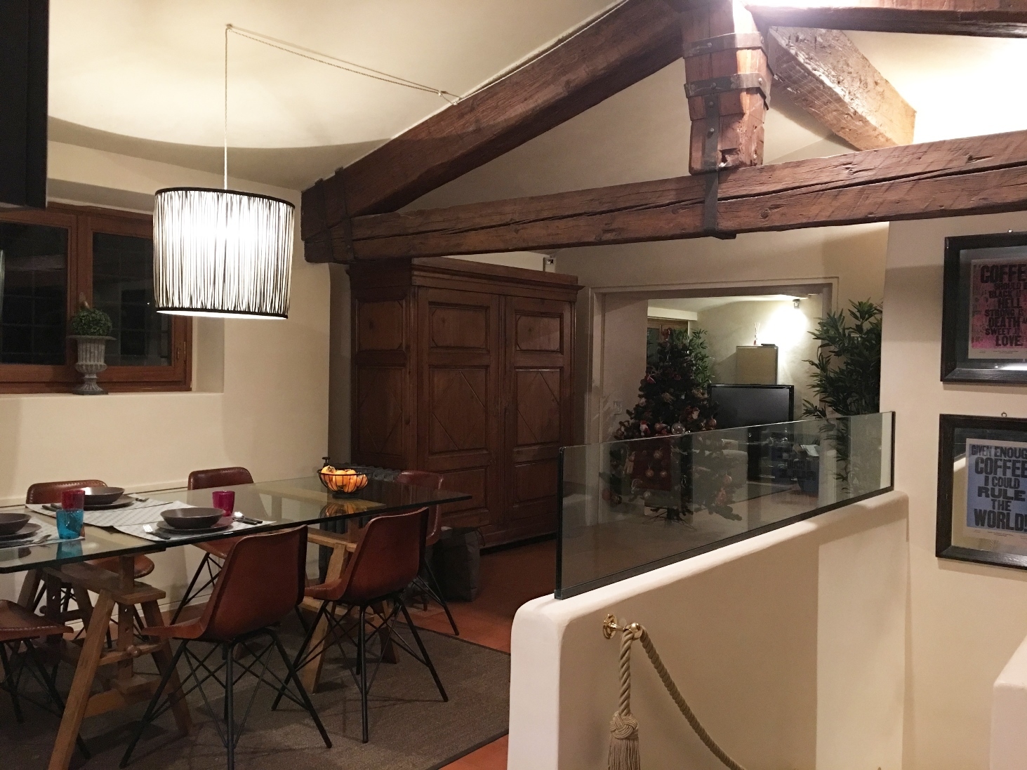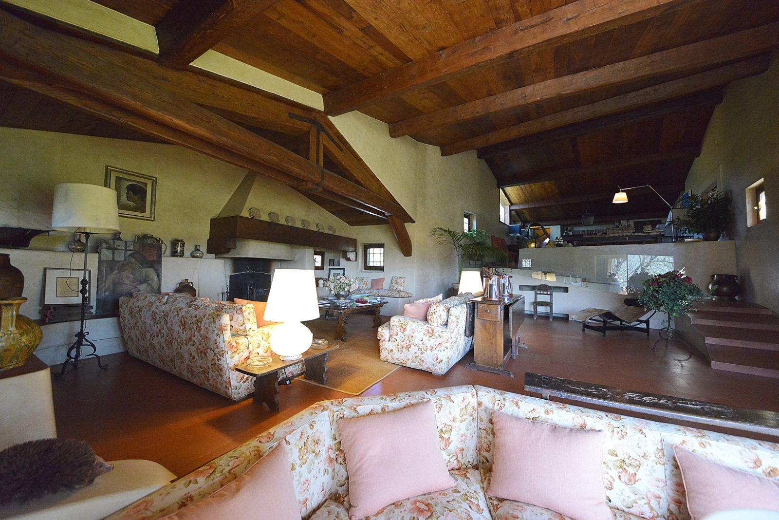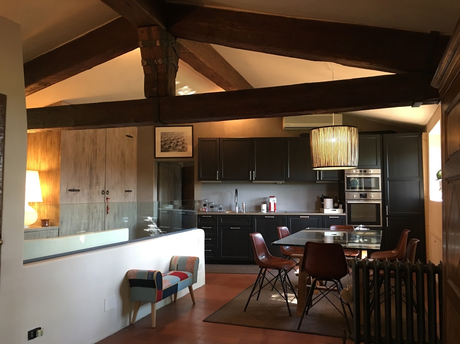 The living area has a ceiling made of recycled chestnut wood with large trusses and chestnut beams.