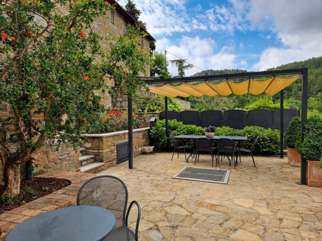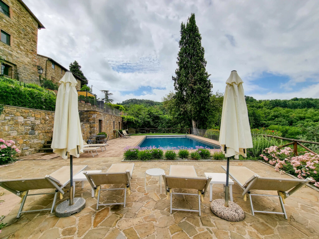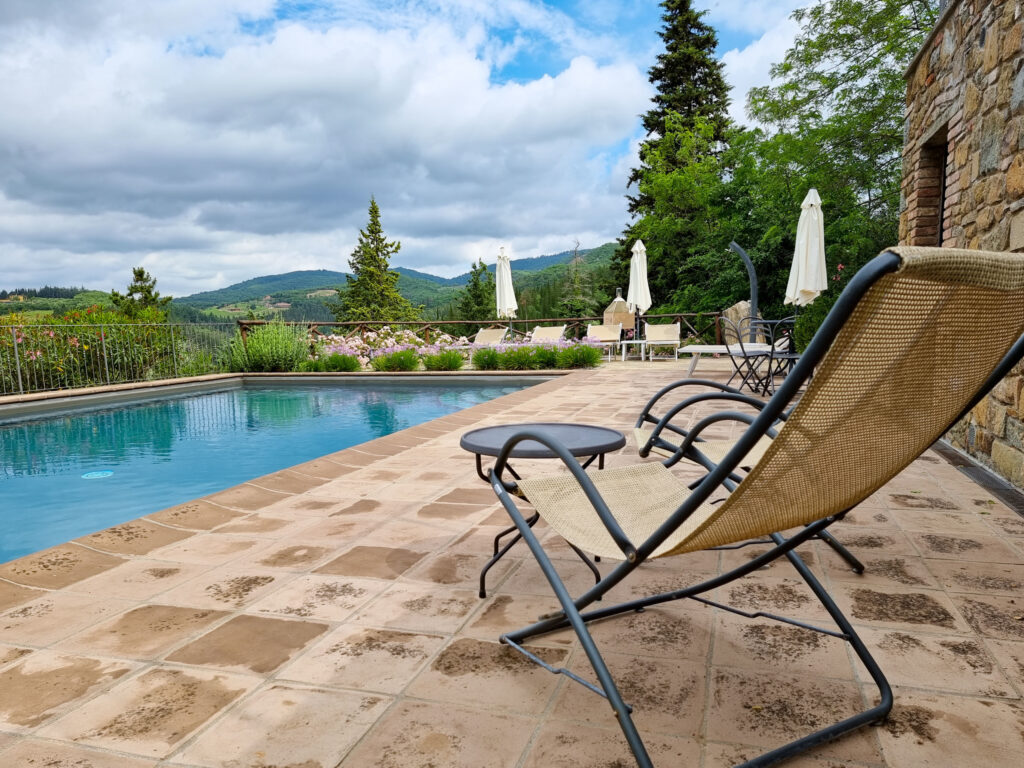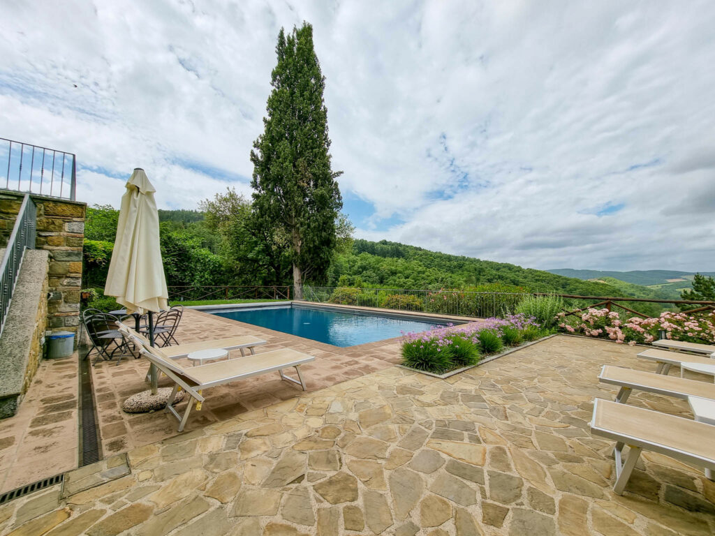 Delightful steps in original pietra serena lead to the enviable chlorine-free private swimming pool with internal steps, set in a large stone terrace with table, chairs, sun loungers and umbrellas. Ideal area for watching the sun set over dinner on the terrace.