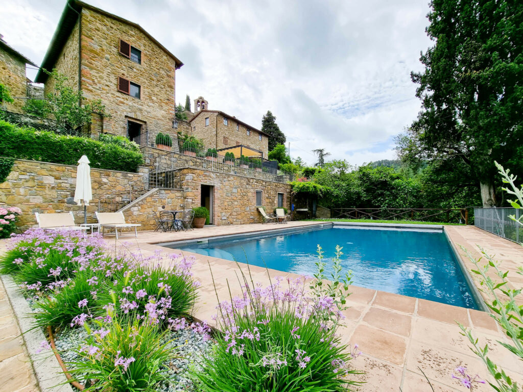 Nestled in the Chianti hills, dominant historic villa of about 210 sqm, perfectly restored and located in a small village near Gaiole in Chianti. Embellished by its multi-level garden and large panoramic swimming pool with views sweeping over the beautiful countryside cultivated with vineyards and olive groves as well as equipped fitness room.