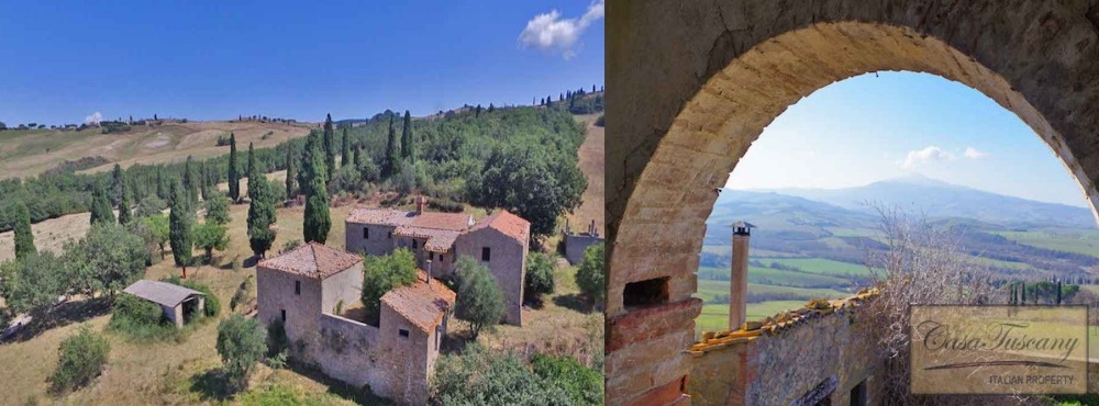 V5046AB | €900,000 | Tuscany, Pienza. This wonderful restoration opportunity is located in a panoramic position, just a few kilometres from the beautiful town of Pienza in the Val d’Orcia in Tuscany, a UNESCO World Heritage Site.